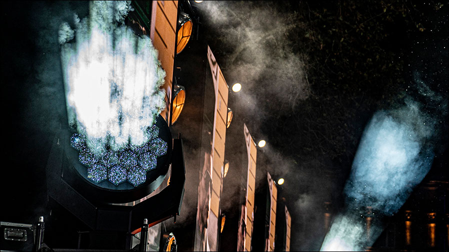 „Wir suchten ein physisch markantes, außergewöhnliches Licht-Element“, erklärt Godin. „Ich kannte den MAD MAXX von Fachmessen und fand ihn beeindruckend.“ Zwischen den umliegenden Weihnachtsmarkt-Ständen musste er aber zunächst eine geeignete Position finden – mit Erfolg: „Wir platzierten je einen MAD MAXX an den Enden der langen Zuschauertribüne und ließen ihre Beams über die Köpfe der Gäste hinweg in den Himmel schießen.“ Dank der scharfen Beam-Kanten durchdrangen die Geräte mühelos das erhebliche Umgebungslicht auf dem Leicester Square.