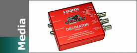 Die kleinen Kästchen, kaum größer als eine Zigarettenschachtel, wandeln alle SDI-Signale von einfachem SD-SDI bis zum 1080p fassenden 3G-SDI zu HDMI/DVI. Außerdem lassen sich die Signale beliebig herunter skalieren und auf dem separaten F-BAS ausgeben.