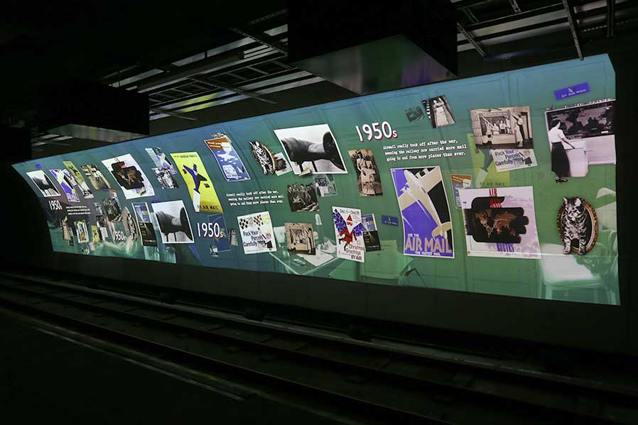 Im Anschluss besteigen die Besucher den Zug und begeben sich auf eine 15-minütige Fahrt durch die Tunnel inkl. Bordkommentaren zur Geschichte der Mail Rail, während sie hinunter zum ersten Bahnsteig gebracht werden, der sie in die Glanzzeit des U-Bahn-Netzes zurückversetzt. Mit einer Mischung von Archivmaterial, animierten Grafiken sowie einer charakteristischen Voice-Performance zur Schaffung eines fesselnden Reiseerlebnisses, erfasst die 18-Meter-Projektion den besonderen Ort und seine Geschichte.