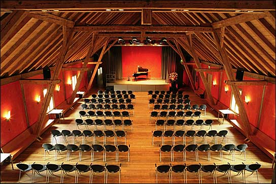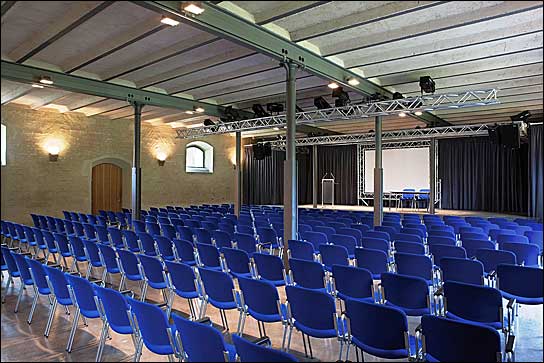 Der "Kleine Saal" im Dachstuhl misst 240 Quadratmeter und beherbergt vier fest installierte UHF-R-Strecken für die reibungslose Durchführung von Tagungen, Podiumsdiskussionen, Kleinkunst-Abenden und Hochzeiten. Auch im Säulensaal mit 196 Quadratmetern Grundfläche setzt man auf das analoge UHF-R Funksystem von Shure.
