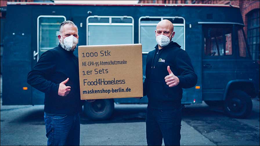 Eintausend FFP2-Masken gingen an Food4Homeless, eine private Initiative, für die Huths Mitarbeiter Christian Eggers (Tontechniker) ehrenamtlich warmes Essen an Obdachlose im Berliner Stadtgebiet ausliefert.