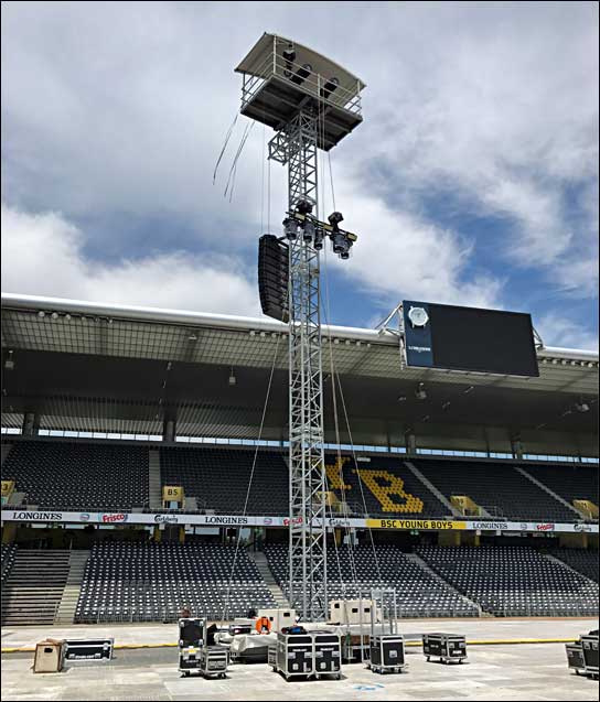 Als Main-PA dienten im Stade de Suisse jeweils 16 x K1 + 3 x K2, ergänzt von je 12 x K1 + 6 x K2 als Outhangs. Für den Nahbereich vor der Bühne setzte Stagelight auf 8 x Kara. Als Delay arbeiteten je 9 x K2 L/R sowie 6 x K2 als Center, um auch die hintersten Ränge des modernen Stadions zu erreichen. Auf der Bühne wurden 2 x 6 K2 mit 70° horizontaler Abstrahlung als SideFills eingesetzt. Angetrieben wurden alle Systemkomponenten von LA-RAKs und LA-RAKs II.