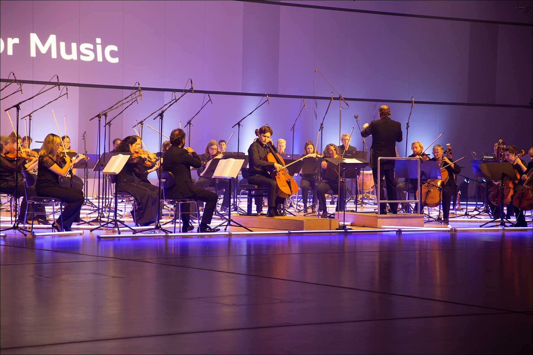Der Raum selbst, wie er für das Konzert abgetrennt wurde, war vor allem eines: extra breit. Nicht nur musste man das Orchester wegen der Abstandsregeln auseinanderziehen, nebenan saßen links und rechts auch noch die zwei mal 60 Konzertbesucher, ihrerseits weit auseinander.