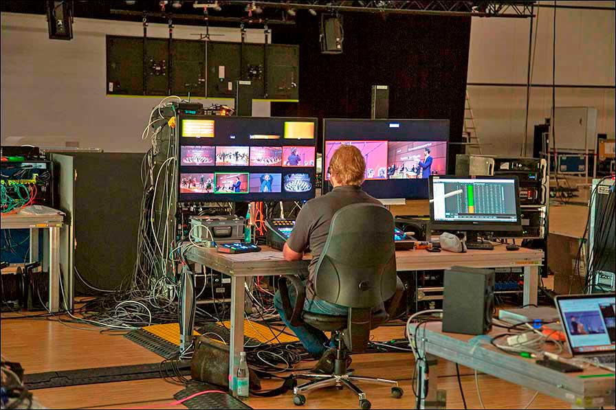 Während des Konzerts saß Christian Schatz an einer grandMA3 mittig vor dem Orchester und war per Intercom im ständigen Kontakt mit Gerd Friedmann, der im abgetrennten Nebenraum in der Bildregie saß und von dort die Blenden der Kameras steuerte, also die Helligkeit, die man auf dem Bildschirm sieht, die Farb- und Schwarzwerte sowie die Feineinstellungen.