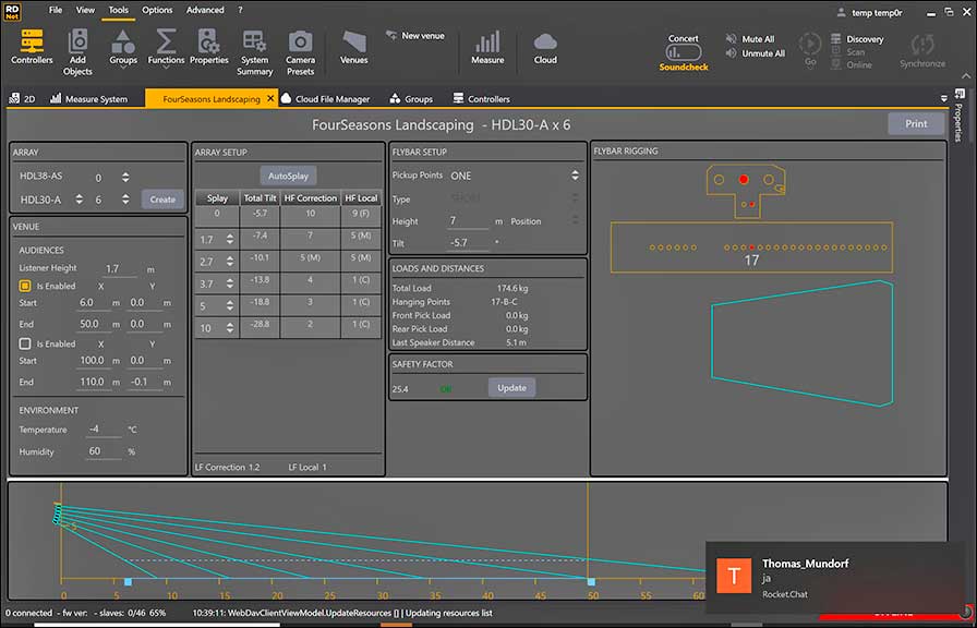 Die neue Version von RDNet hat jetzt als Prediction-Tool den RCF Shapedesigner an Bord. Mit diesem werden die Berechnung der Winkel, Presets und Sicherheitsfaktoren für Line-Arrays durchgeführt und eine einfache Übernahme der Werte in die Lautsprecher, basierend auf aktueller Temperatur und Luftfeuchte, möglich.