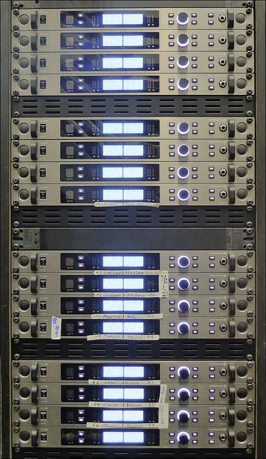 Das beyerdynamic TG 1000-System bietet an dieser Stelle eine komfortable Flexibilität, denn Sender und Empfänger können mit einer enormen Schaltbandbreite von nicht weniger als 319 MHz aufwarten und decken so den UHF-Frequenzbereich von 470–789 MHz mit nur einer Hardware ab. Die Konfiguration des Systems kann über das Web-Interface des Empfängers gesteuert werden - auch für mehrere miteinander gekoppelte Empfänger gleichzeitig. Auf diese Weise war die Einrichtung des mit 30 Drahtlos-Kanälen relativ großen Züricher Systems kein Problem.