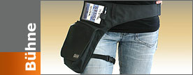 Wird das Beinband nicht benützt, kann es entweder auf der Innenseite der Tasche verstaut werden oder man nützt es, um Isolierband oder Gaffa-Tape daran zu befestigen. Ist die Arbeit getan, dreht man die Tasche um und findet die Aftershow-Seite inklusive Getränkehalterung.