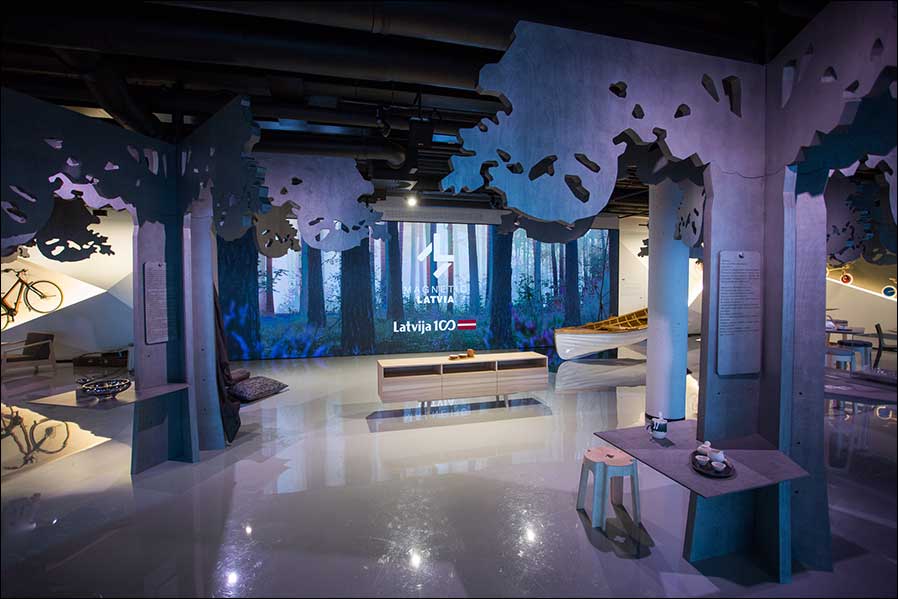 Auf einem entlang der Hauptwand positionierten 10 x 3 Meter großen LED-Display, werden Kurzfilme gezeigt, die einem Geschichten über die lettische Bevölkerung, Wirtschaft, Kultur, Traditionen und Tourismus näherbringen.